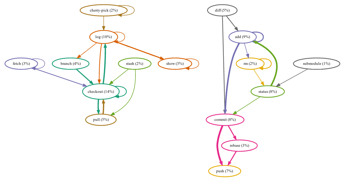 How it works: You tell it the sequence of git commands you’ve ever executed. It gives you back pretty pictures. Like this fantastic picture of Selena Deckelmann’s workflow! I really like how this one makes it clear when you’d want to use rebase (in between commit and push), or stash (before checkout and pull). It is a thing of beauty.